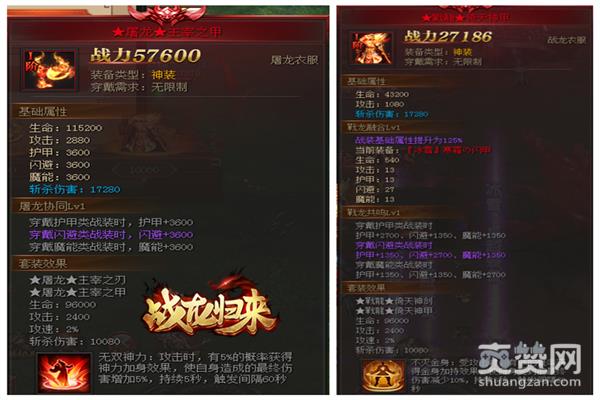 当大师点数累计达到6500时,可领取“屠龙·主宰之甲”。穿戴“屠龙·主宰之甲”可以获得大量属性加成,更重要的是当它与“屠龙·主宰之刃”同时穿戴时可以激活套装效果并获得“无双神力”——攻击时,有5%的概率获得神力加身效果,使自身造成的最终伤害增加5%,持续5秒。而当大师点数累计达到10000时,可领取更加强悍的神装——“战龙·倚天神甲”!战龙·倚天神甲可以获得更多更大量的属性加成并且与“战龙·倚天神剑”同时穿戴可以激活套装效果并获得“不灭金身”——受攻击时,有5%的概率获得金身加持使效果,使自身受到的最终伤害减少10%,持续5秒。