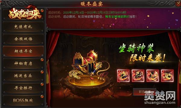 活动期间,不仅有轮回神装概率翻倍,更有稀有坐骑神装限时抽取!听说带上新坐骑便能一骑绝尘,更容易取胜敌人,得到三龙霸主的青睐哦。