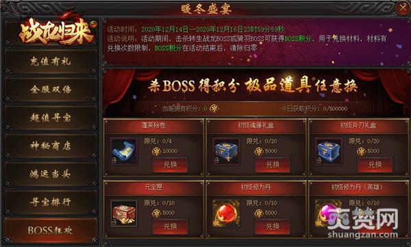 活动期间内,玩家击杀BOSS获得“boss积分”,“boss积分”可用于兑换修为丹、蓬莱秘卷、魂锤、斧刃等多种材料,每种材料均有兑换次数限制。“boss积分”在活动结束后将清除归零,所以记得要及时兑换哦!