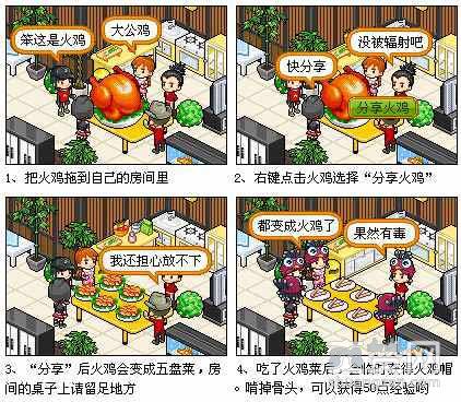 1、玩家可以在中 央广场找到一个烤架,当你包包里有火鸡肉,便可以去广场里烤制香喷喷的火鸡啦!烤制成功后,包包里就会有一个已经烤好的火鸡。