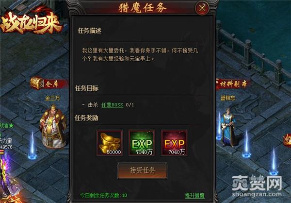 第一位要介绍的就是“武擎苍”,他负责为兄弟们提供猎魔任务。猎魔任务能获得大量经验和元宝,该任务次数一共有10次,每日会自动重置。此外玩家可以消耗98龙钻获得1次次数,最多购买任务次数20次。猎魔任务是非常简单的,击杀boss的转生不高,轻轻松松就能拿下任务。