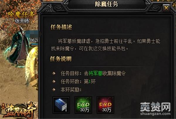 在说神级技能之前,我们先来了解一下普通技能是如何获取的。贪玩平台《蓝月传奇》的普通技能书可以通过在荒漠土城中找到NPC“张天师”,通过他完成“除魔任务”。除魔任务需要玩家前往将军墓击杀精英Boss,从而获得将军令。将军令可在“张天师”出兑换技能书以及经验值,上交数量越多,获得的奖励也就越多,最多可以四倍领取。