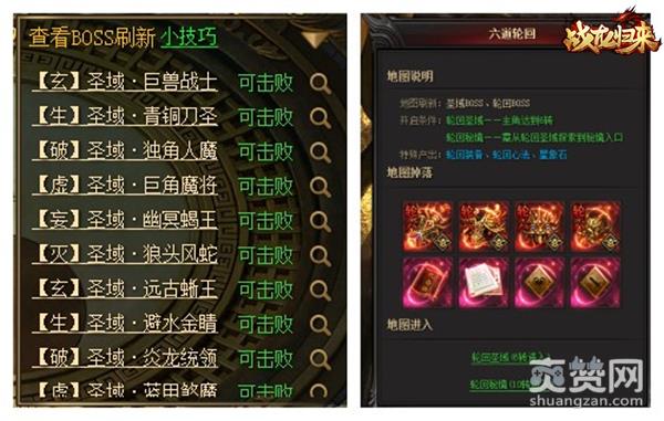 玩家转生达到6转即可在“六道轮回”处,通过与NPC“非天”对话进入“六道轮回”地图。当进入圣域后,玩家可从“玄”、“生”、“破”、“虚”、“妄”、“灭”六门中任选其一进入,每个门又各有六条通道六条通道中只有一条可以通往下一层圣域,其余五条通道玩家会遭遇“BOSS”、“变异BOSS”、“圣域BOSS”的袭击,凶险万分。