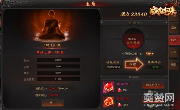 当达到3转后,玩家可以在人物界面中的转生中用经验兑换修为。兑换修为时要注意池子里的经验过低会掉级,而且vip的等级和兑换次数也挂钩,也可以通过右下角直接购买并使用。另外玩家也可以通过每日祈福和炼制快速升级获取经验,从而兑换修为。
