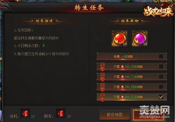 除了经验之外,修为丹也是提升转生修为的重要道具。日常任务里有个转生任务,前面5次可以免费领取多倍奖励(倍数根据vip等级决定,最高是5倍)最多获得50个主角和英雄修为丹。