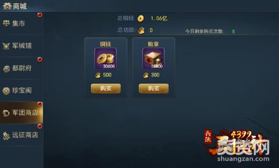 在军团商城中可消耗功勋购买铜钱或粮草,需注意的是商城中每日购买次数有限,且粮草和铜钱共享购买次数。升级军团即可提升购买次数上限。
