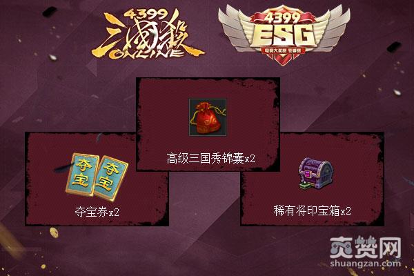 ESG决赛礼包:普通皮肤包*1,稀有将印宝箱*1,夺宝券*2,高级三国秀锦囊*2