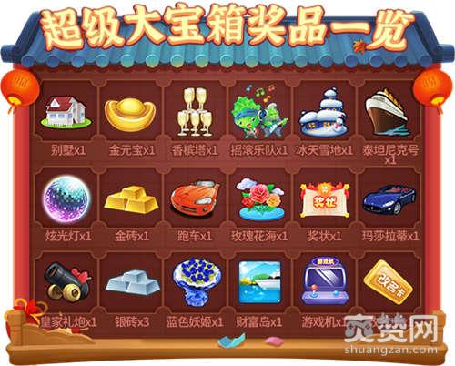 11. “超级大宝箱”中,获得“金元宝、金砖、银砖”几率合计:5%,获得“摇滚乐队、玫瑰花海、财富岛、泰坦尼克号”几率合计:30%,其余奖品获得几率合计65%。