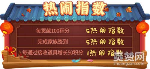 在每个家族,根据家族总计的”热闹指数”,可领取对应的奖励,该奖励每日重置,但当天至少获得50热闹指数的族员才能领取: