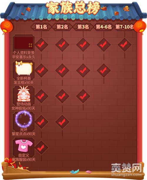 例:活动结束后排名第3的家族中,在活动期间累积获得100“热闹指数”的所有族员都能获得“个人资料背景·平安喜乐”x永久、柯基发言框x90天、女神庇佑登场动画x90天作为奖励!