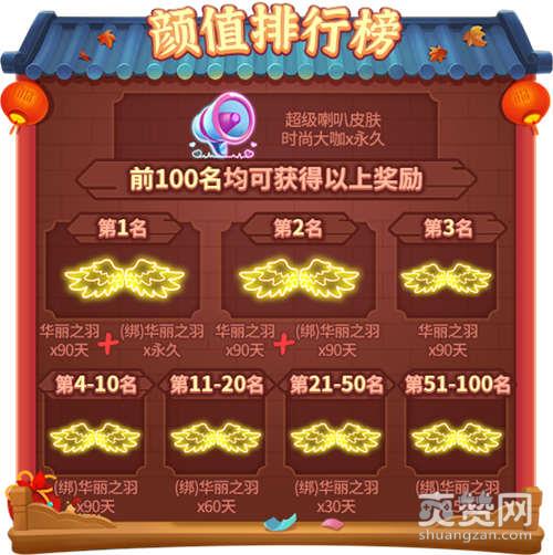 活动结束后,位于“颜值排行榜”前100名玩家将能够获得如下奖励: