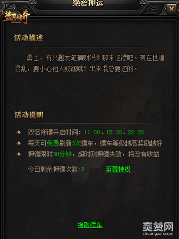 贪玩平台《蓝月传奇》押镖任务是一项日常任务,随时随地都能参加。不过双倍押镖却不是随时都会有的,时间就固定在每天的11:00-11:30、16:00-16:30、22:00-22:30。