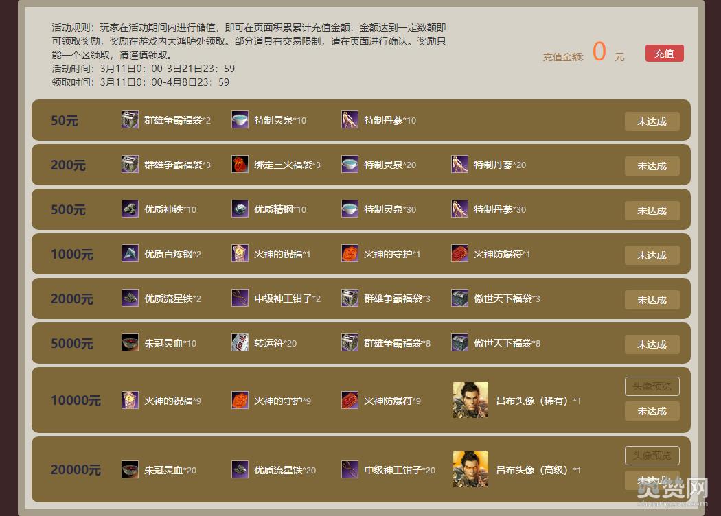 活动期间,玩家累计充值金额达到一定额度即可领取丰厚奖励。