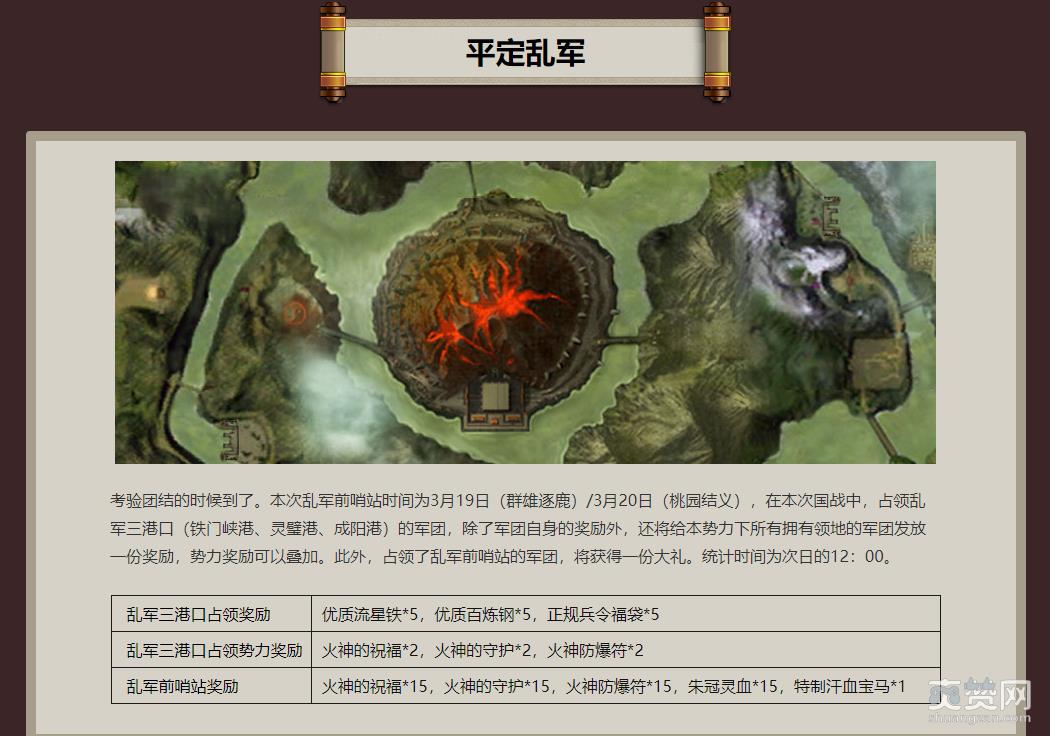 在国战中占领乱军三港口(铁门峡港、灵璧港、成阳港)的军团,除了军团自身的奖励外,还将给本势力下所有拥有领地的军团发放一份奖励,势力奖励可以叠加。此外,占领了乱军前哨站的军团还将获得朱冠灵血、特制汗血宝马等额外奖励