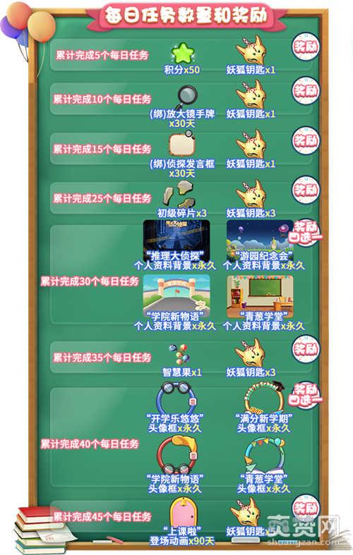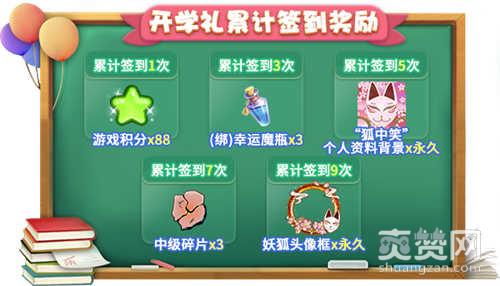 活动期间,完成每日签到即可领取1份“开学礼包”,获得“妖狐钥匙”,解锁妖狐的特别奖励!并且,根据您累计签到次数,还能领取额外奖励!