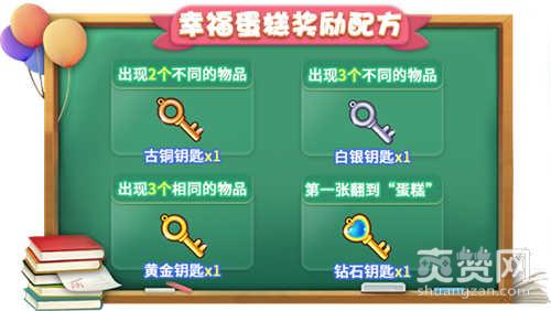 活动期间,在一块隐藏的4x4方格中藏有“西瓜”、“草莓”、“菠萝”和“蛋糕”!每种水果有5份,而蛋糕只有1份!每次花费3000游戏币可参与制作“幸福蛋糕”,从方块中翻开任意三块,并根据所出现的物品获得对应奖励: