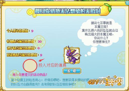 准备好道具的皮卡亲,在中 央广场处NPC蜜汁哒摸王选择“投食入口”添加背包里的相应道具,一起战胜蜜汁哒摸王吧!