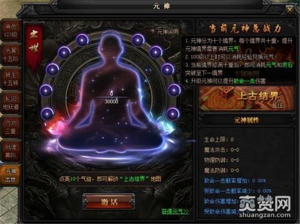 当角色等级达到100级,即可开启人物及英雄的“元神”系统,进行元神修炼,元神分为十大境界:出世、练气、固本、培元、红尘、明心、小悟、大悟、飞升、飞仙。每层大境界共有十重,修满十重,即可突破元神至下一境界。元神初始境界为“出世”,当角色等级达到100级以上,可通过消耗经验和金币,或购买元神丹来兑换“元气“。通过消耗一定“元气”顺时针依次激活10个气旋,将当前境界修满十重。