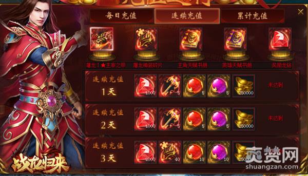 充值任意金额,就可以领取三天的豪礼,最小的充值,换取最大的利益,奖励内容有传承武器、经验加成buff、绝版称号、主角坐骑和翅膀、秘宝钥匙等。而且进入游戏跑主线任务跑到一定等级会触发这个限时首充的一个小福利,充个首充可以顺便把这额外的龙钻领取回去。这是相当划算啦!