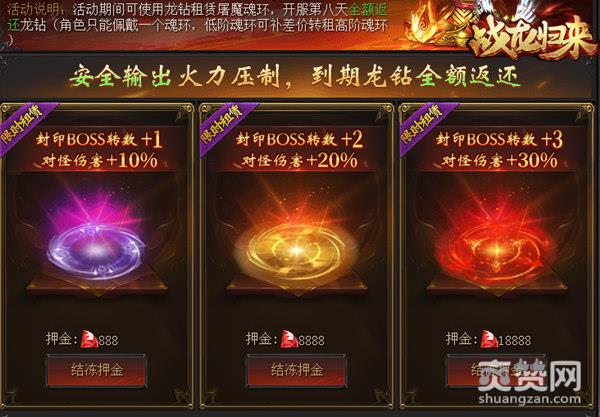 开服活动里面的魂环租赁这主要是对怪物的一个压制和对怪物封印,前面我们小户玩家没有什么钱提升战力,那么这个投资这个是必须的,而且龙钻8天后是全部返还的,可以加速度过前期的疲软期,这也是杀怪必备良器!