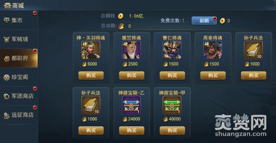 15级开放都尉府,都尉府中会出售武将碎片、武将经验书、修炼丹、训练材料等资源,消耗功勋可进行购买。点击都尉府中的刷新按钮,可刷新当前商品。系统每日将赠送5次免费刷新的次数,免费次数耗尽后再次进行刷新需消耗铜钱。
