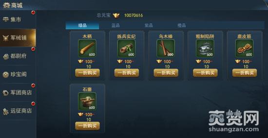 15级开放军械铺,军械铺中出售所有武将训练材料。军械铺默认开放绿色材料售卖,当玩家等级到达30、50、75级时,会分别开放蓝色、紫色、橙色材料售卖。军械铺中每日会重置商品折扣。