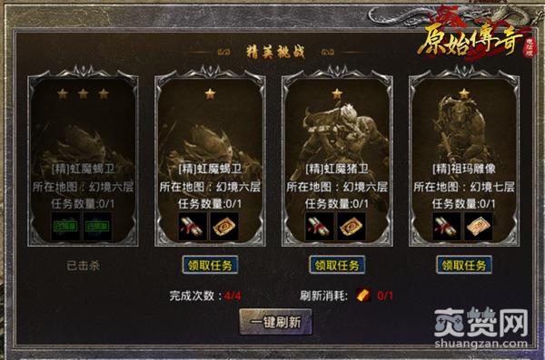 精英挑战每次能够随机刷新四个不同星级的任务,这里我强烈建议一定要刷三星任务去做,因为只有三星任务才能获得以上提到的“玉佩试炼”和“法阵试炼”的门票,同时会附送一个传奇币宝箱,每个箱子可以获得3000传奇币,相当划算啦!