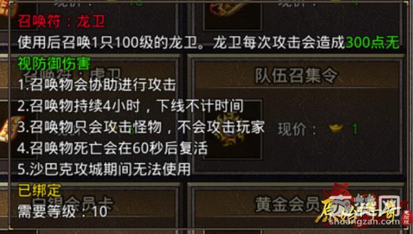 当玩家升到17级时,会出现一个支线任务,可以召唤一只守卫来帮助玩家攻击敌人,守卫分三种。第一种,巨型多角虫,需要等级10级才能召唤,固定伤害为100点,可用300传奇币购买。第二种,虎卫,需要等级10级才能召唤,固定伤害为200点,可用8元宝购买,白银会员每天可以通过领取工资的形式来获取一张虎卫召唤符,或者购买6元直购礼包获得。第三种,龙卫,需要等级10级才能召唤,固定伤害为300点,可用18元宝购买,黄金会员每天可以通过领取工资的形式来获取一张龙卫召唤符。
