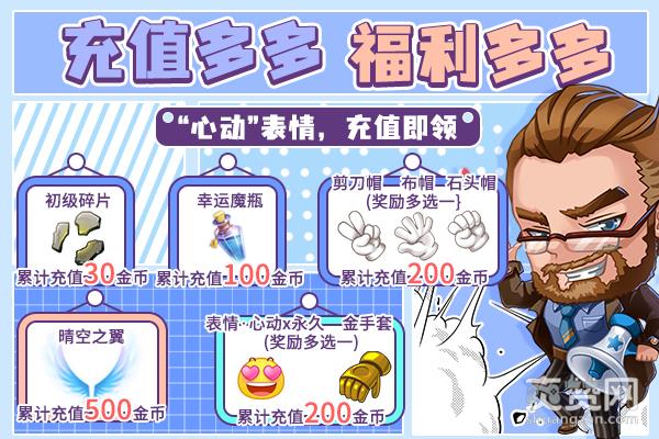 活动期间,累计充值999金币,收下充值大礼包,内含:特别装扮、晴空之翼、心动表情等奖励。
