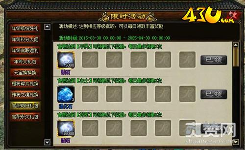 当玩家达到名士,就可以在限时活动中领取相应的永久礼包中的橙色武将碎片,但是只能领取一次,每日礼包是可以叠加领取的,在年底时,玩家还可在官职返利系统中获得官职奖励,只是也是一次哦!