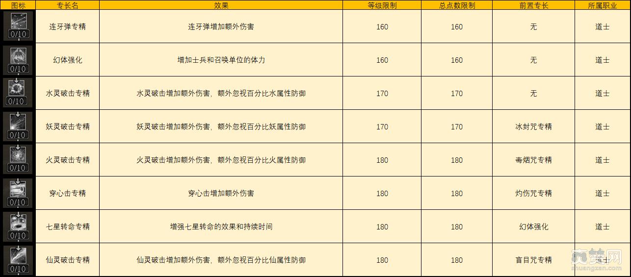 道士的新专长【水灵破击专精】、【妖灵破击专精】、【火灵破击专精】和【仙灵破击专精】可以在造成额外伤害并额外忽视目标部分对应属性防御力,道士的独有的灵镖攻击将会变得更加犀利。【七星转命专精】可以增强“七星转命”技能的效果的持续时间,大大增强了道士的生存能力。火力全开的道士,是会令任何敌人都感到心悸的存在。