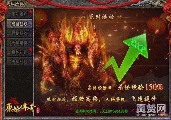 《原始传奇》电脑版游戏中随着等级的不断提升,升级的难度也在不停的升高,但是不用怕!官方为庆祝《原始传奇》电脑版周年庆,限时开放经验狂欢活动!活动期间杀怪经验150%,让你在刷刷刷的同时经验蹭蹭蹭地往上涨,让你飞速提升等级的同时体验不一样的玩法!还等什么?快来参加经验狂欢活动呀!
