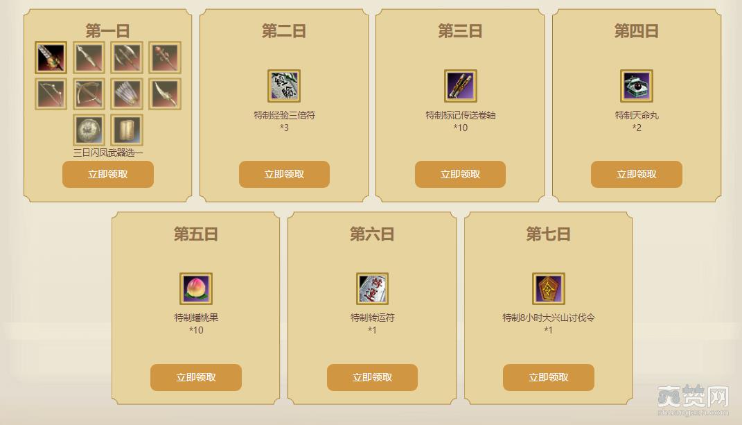在活动期间内,玩家只需每日登陆游戏,累积达到一定天数后,即可在活动网页领取相应的奖励。首日就能领取自选特制闪凤武器,战力立即飙升,后续还可领取特制经验符、特制转运符、特制讨伐令等道具奖励。