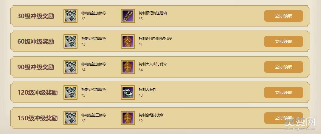 玩家在活动时间内,每提升一定等级就可以在活动页面领取丰厚的经验礼包奖励,获取大量特制经验符、特制讨伐令等道具。新服开启,在经验礼包的加持下,快速地提升角色等级吧!