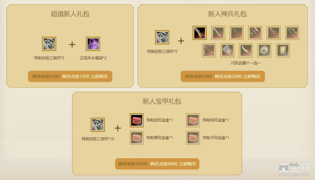 玩家可以在限定时间内,前往活动网页购买新人礼包,共有三款礼包可供选择(仅可通过网页商城券购买),还可享受专属礼包折扣!购买礼包可获得正规兵令福袋、自选闪凤武器、特制防具宝盒等道具,士兵、武器、防具一应俱全,全力助阵新人玩家玩转三国战场!