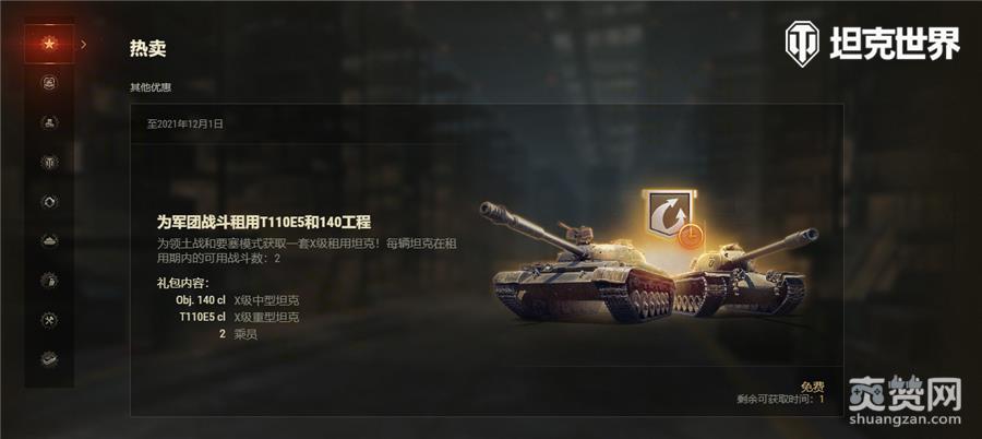 虽然领土战需要使用10级坦克才可进入,但车长们也可以使用银币来租用坦克来参与战斗,本赛季可租用的坦克包括S系140工程和M系T110E5这两款,您的首次租用将免除费用并提供两次使用机会,而后续您也可以花费少量银币来延长租用期限。当赛季结束后,租用坦克所获得的经验将会转移至对应系别的1级坦克身上,而装备的指令、配件、贴花、风格等元素也将移除送入仓库,不用担心遗失哟~