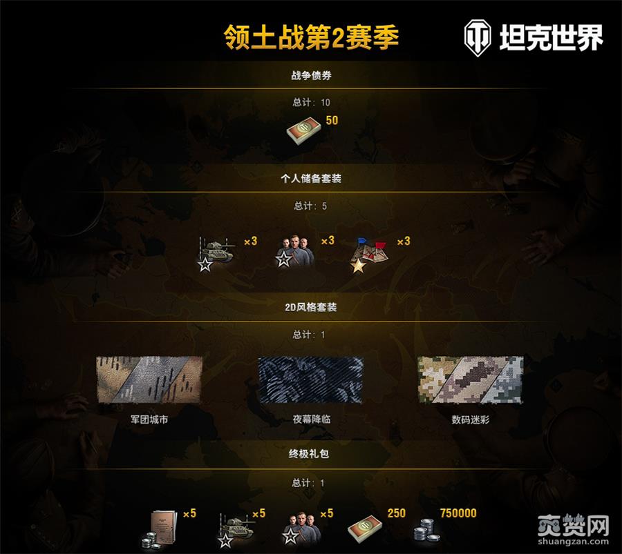 在第2赛季结束时,军团将根据排名来领取相应的报酬,除了代表冠亚季军的第2赛季优胜者勋章和巨龙吐息2D风格外,还包括了全新的2D风格“克拉肯”,而第2赛季专属贴花和禁卫军中尉希尔斯:勇气贴花也会奖励给作战英勇的坦克手们。