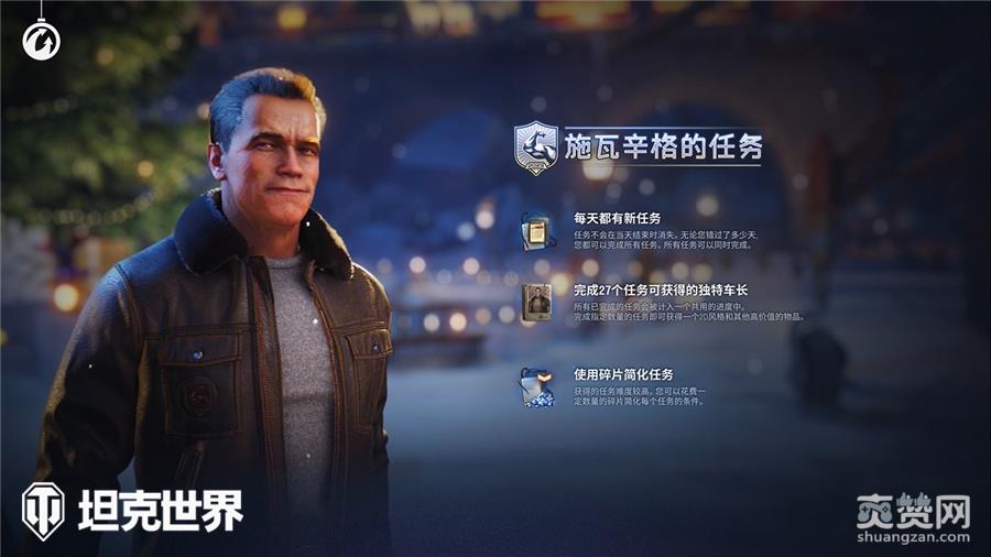 一旦完成任务挑战,你不仅能获得小型补给箱和假日邮票,达到一定任务数量后,还可得到专属2D风格、特殊勋章、酷炫签名等奖励,并且施瓦辛格也会作为特殊乘员加入您的团队,让您化身坦克战场的“终结者”,凭借气场十足的强者威势让敌人胆寒吧!