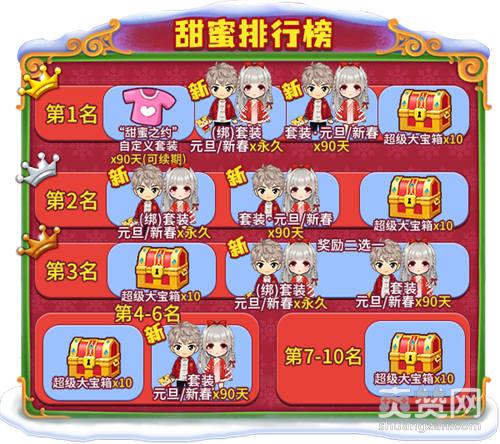 活动结束后,甜蜜双方累计消费的金币数量将进入“甜蜜排行榜”,活动结束后,为排行榜上前10对“甜蜜之约”玩家发放奖励!