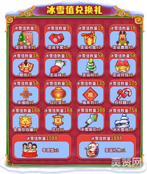 活动期间,将您的道具换成“冰雪值”吧!使用“冰雪值”,兑换圣诞和新年好礼吧!