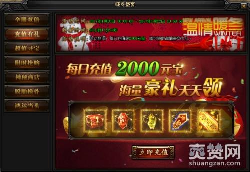 活动说明:活动期间,每日充值满2000元宝,即可领取超值豪华大礼。