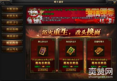 活动说明 : 活动期间,玩家可购买帮会改名卡、角色改名卡和英雄转职卡,每张卡限购1次,请珍惜这难得的机会哦!