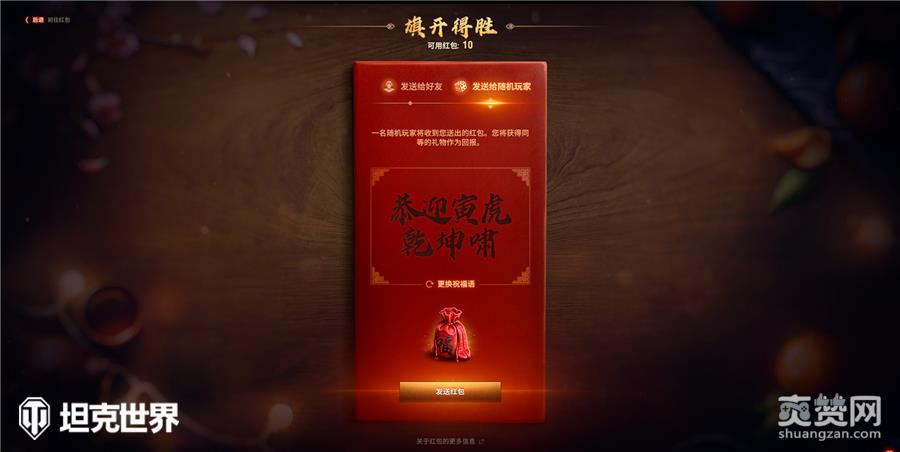 新春佳节即将来临,您可以在《坦克世界》中通过春节寄福活动发送并接收精美礼物。2月1日至2月15日期间,您可以获得红包并将TA们发送给您在游戏中的好友或随机玩家,红包含有能够提供大量游戏内加成的装饰。