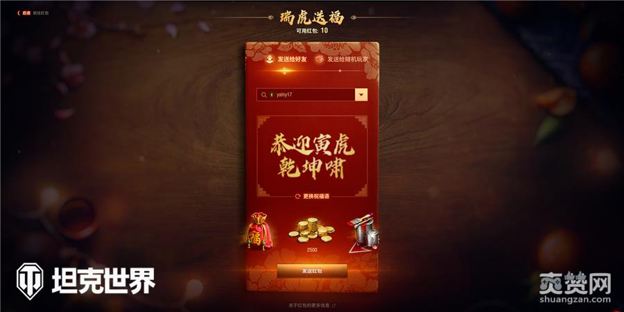 福虎临门决胜千里,醒狮闹春步步生风!今年《坦克世界》中依然举办了新春主题的节日活动,让您可以通过赠送红包的方式,在游戏中给好友拜年,让战友情暖彻心扉。想在2月初春收获更多惊喜,那就快登录游戏与好友们互相寄福吧!