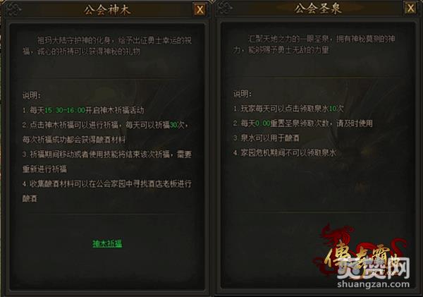 37《传奇霸业》神木祈福在开服14天后,由公会开启公会家园,每天下午15:30-16:00玩家便可自行进入公会家园,点击“公会神木”进行祈福。祈福本是一件庄重严肃的事,所以,在祈福期间,如果移动和使用技能将会打断该次祈福,需要重新点击公会神木进行祈福,玩家每天可以进行30次祈福,每次祈福成功都可以获得酿酒材料。