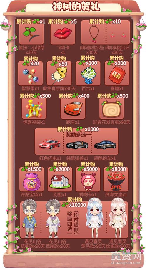 活动期间,根据您在“祈愿神树”购买绿芽的数量,领取神树的贺礼!并且还将对小伙伴们购买绿芽的数量进行排名,在活动结束后,为排行榜上前100名玩家发放奖励!