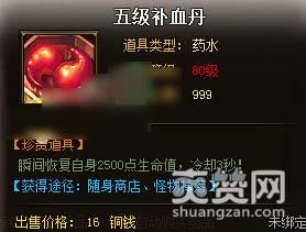 使用五级补血丹要求玩家等级达到80级,可以瞬间恢复自身2500点生命值,冷却时间是3秒。