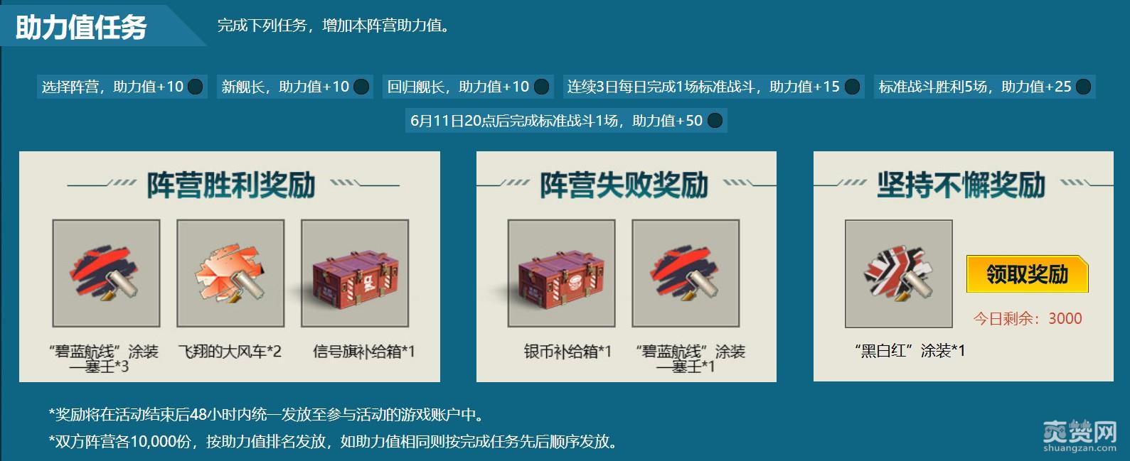 碧蓝航线阵营对决中,最终胜出的阵营,助力值最高的10000名指挥官,将会获得一份胜利奖励,包括“碧蓝航线”-塞壬涂装*3、“飞翔的大风车”*2、信号旗补给箱*1。失败阵营中助力值最高的10000名指挥官们,将获得银币补给箱*1、“碧蓝航线”-塞壬涂装*1。同时,每天在阵营对决页面中,还将发放3000个“坚持不懈”奖励,先到先得哦。