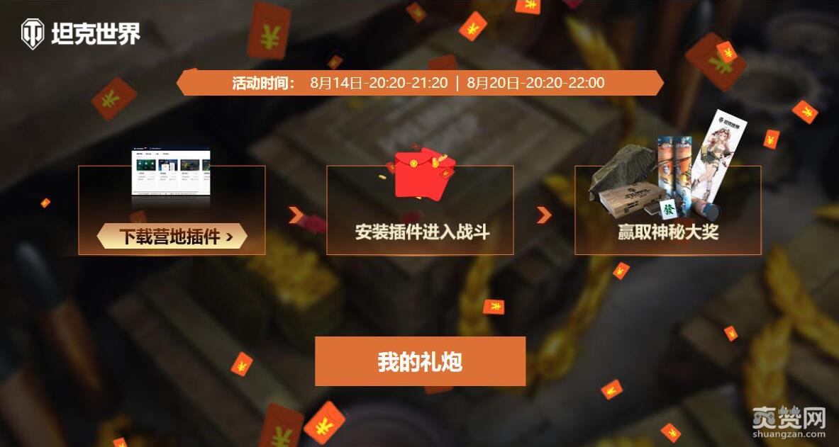 下载PC端坦克营地助手,安装单场战绩插件后参与标准模式战斗,您即可参加红包雨活动。在8月14日-20:20-21:20与8月20日-20:20-22:00期间进入战斗,在战斗过程中会有大量积分红包掉落。幸运儿更有机会获得礼炮大奖,其中包含了稀有的特种坦克及丰厚的实物周边奖励!