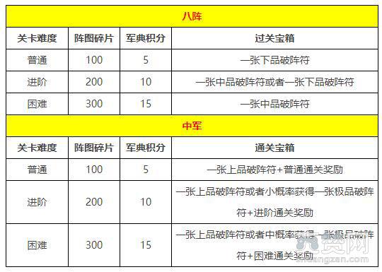 通关条件:每轮共九关,分为八阵和中军,通过八阵中任意四阵后可挑战中军,击败中军后本轮通关。单局时间若超过1小时,本局游戏视为失败。